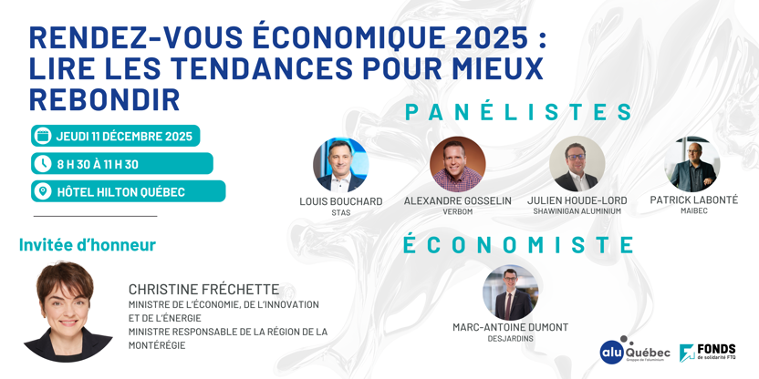 Le 11 décembre, prenez part au Rendez-vous économique 2025 : Lire les tendances pour mieux rebondir, un événement incontournable organisé par AluQuébec et le Fonds de solidarité FTQ, à l'hôtel Hilton de Québec, de 8 h 30 à 11 h 30.